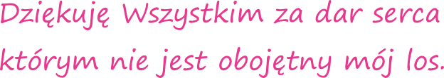 Wszystkim, którzy przekazali 1% podatku za rok 2013 na konto fundacji dla naszej córki Julii z głębi serca dziękujemy. Dziękujemy wszystkim, którzy przekazali 1% podatku za rok 2012 na konto fundacji dla naszej córki Julii. Dziękujemy firmie Jelenia Plast Sp. z o. o. za przekazanie środków na konto fundacji umożliwiających leczenie i rehabilitację naszej córki Julii. Dziękujemy wszystkim, którzy przekazali 1% podatku za rok 2014 dla naszej córki Julii. Za przekazanie 1% podatku za rok 2015 na konto fundacji dla naszej córki Julii,dziękujemy. Dziękujemy wszystkim, którzy przekazali 1% podatku za rok 2016 na konto fundacji dla naszej córki Julii.